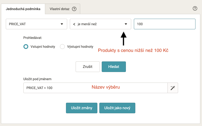 Můžete si vyhledat konkrétní produkt a ten manuálně skrýt a pokud se chystáte skrýt ve feedu větší množství produktů, doporučuji si vytvořit výběr produktů. Pokud máte například příliš levné produkty, které generují vysoké náklady bez objednávek, můžete si je vyhledat pomocí jejich ceny (PRICE_VAT), výběr uložit a využít jej v pravidlech.