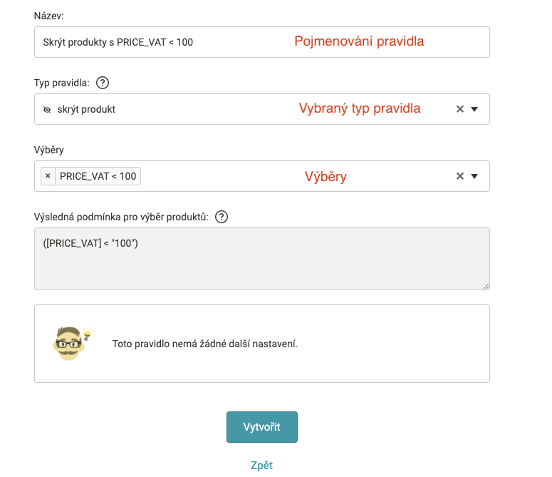 Typ pravidla zvolíme “skrýt produkt”, vybereme výběr a uložíme. Po aplikování pravidel se tyto produkty přestanou automaticky zasílat do XML feedu.